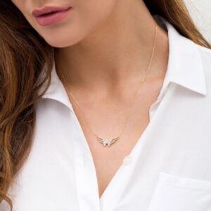 Crafted in warm 10K gold, this look showcases diamond-lined ribbons sculpted into the classic “WW” logo at the center. Polished ribbons complete the triple-row wing design. Radiant with 1/8 ct. t.w. of diamonds and a brilliant buffed luster, this symbol suspends centered along an 18.0-inch cable chain, with an additional closure ring at 16.0 inches, that secures with a spring-ring clasp. This exclusive fine jewelry collection inspires you to wear your strength, confidence and power.