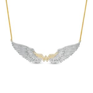 Soar to new heights in style with this show-stopping diamond wing necklace. Crafted in warm 10K gold, this dazzling design features layered feathers decked with shimmering diamonds. At the center, the logo sparkles with diamond-studded detail. Spectacular with 2 cts. t.w. of diamonds and a brilliant buffed luster, this 2.9-inch look suspends centered along a 15.1-inch wheat chain that secures with a lobster claw clasp. This exclusive fine jewelry collection inspires you to wear your strength, confidence and power.