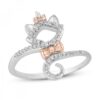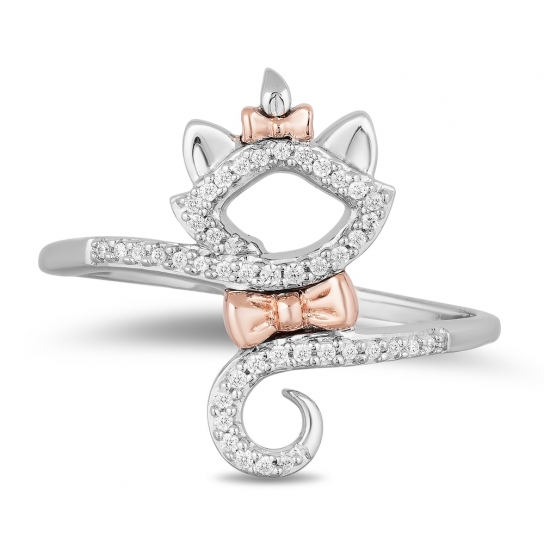 Ring featuring a cat silhouette outlined in sparkling round diamonds. Reminding us of the fun and playfulness of family, the bow details are crafted in 10K rose gold for a complementary pop of color. The sterling silver ring has a total diamond weight of 1/10 carat. .
