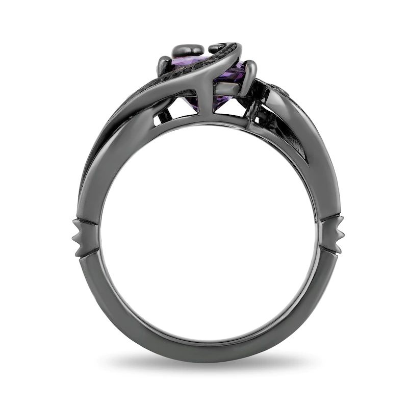 A gripping style, this gemstone and diamond ring captures your adventurous side. Crafted in sterling silver with black rhodium plate, this enticing look showcases a 10.0 x 8.0mm oval-shaped bright purple amethyst enveloped in sculpted tentacles glistening with alluring black diamonds. Crowns inset gleam lower down the split multi-row shank. Radiant with 0.23 ct. t.w. of diamonds and a brilliant buffed lustre, this choice is a beguiling addition to your wardrobe.