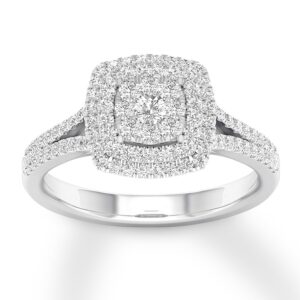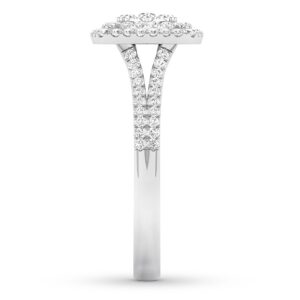 A lovely symbol of forever, this pretty engagement ring features a halo design in the center and a split-shank band adorned in sparkling round diamonds. The 10K white gold ring has a total diamond weight of 1/3 carat.